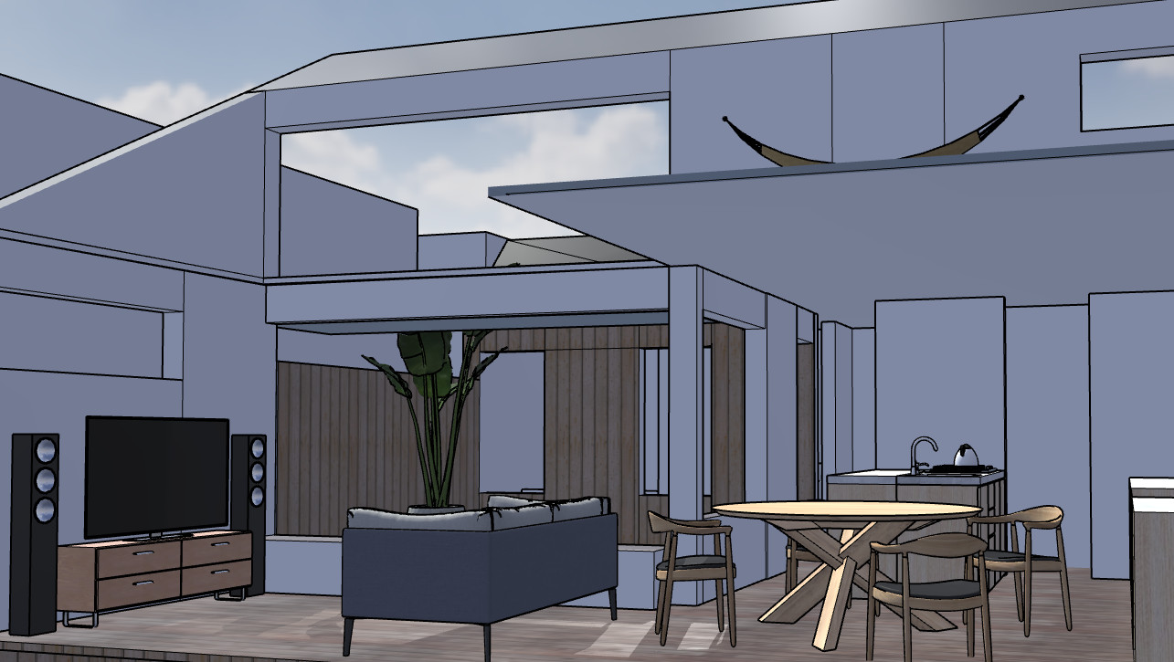 LDKの主役は、外部からの視線を遮りつつ空へ開かれた「屋上デッキ」です。