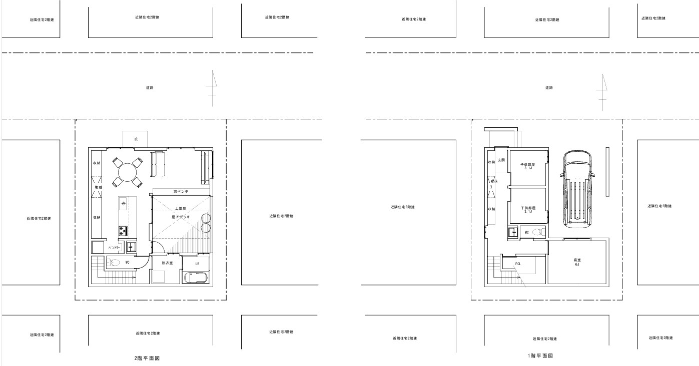 住宅が密集する30坪の敷地において北側接道という悪条件でもプライバシーを確保しながら「いかに子供たちが健やかに家族が一体感を持って暮らせるか」を追求した事例です。